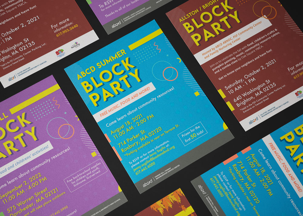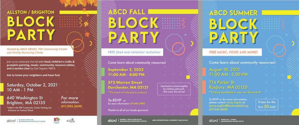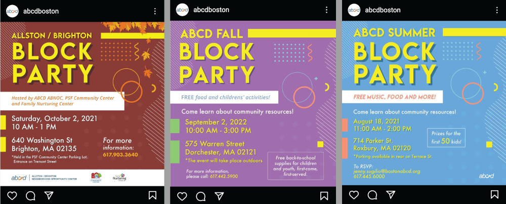 A series of 3 posters to promote upcoming block parties in various Boston neighborhoods. Also adapted for social media.